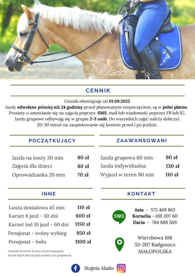 Jest także możliwość umówienia się na pracę z ziemi, spacer z końmi w ręku, lonżę dosiadową czy też wyjazd w teren. Ceny poszczególnych zajęć oraz czas ich trwania znajdziecie na grafice poniżej.